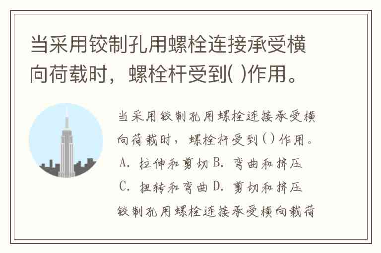 当采用铰制孔用螺栓连接承受横向荷载时,螺栓杆受到( )作用。 A. 拉伸和剪切 B. 弯曲和挤压 C. 扭转和弯曲 D. 剪切和挤压