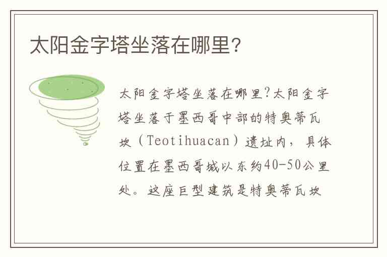 太阳金字塔坐落于墨西哥中部的特奥蒂瓦坎(Teotihuacan)遗址内,具体位置在墨西哥城以东约40-50公里处。这座巨型建筑是特奥蒂瓦坎文明的标志性遗迹,而非玛雅文明——需注意与墨西哥尤卡坦半岛奇琴伊察的玛雅金字塔区分开。其坐标为北纬19°41'32.50'',西经98°50'37.00'',作为中美洲最大的建筑之一,高约65米,底边长度达225米,历史可追溯至公元1世纪至7世纪。