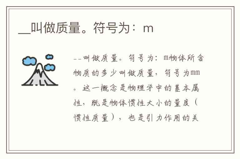物体所含物质的多少叫做质量,符号为。这一概念是物理学中的基本属性,既是物体惯性大小的量度(惯性质量),也是引力作用的关键因素(引力质量),且实验已证实两者等价。