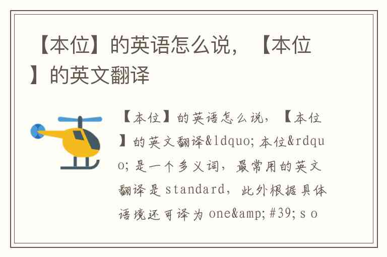 机构/岗位:指“本单位”或“自己的岗位”时,用 one's own department or unit 或 one's own post 。例如“本位工作”即“the work of one's own department” 。