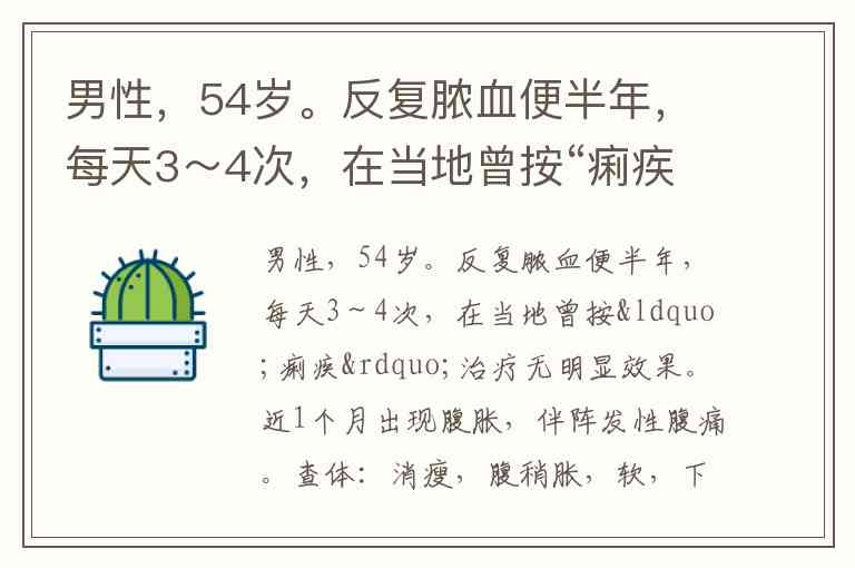 该患者54岁男性,出现反复脓血便半年且按“痢疾”治疗无效,近1个月伴腹胀、阵发性腹痛,查体消瘦、右下腹可触及质硬活动肿块,高度怀疑右半结肠癌。右半结肠癌常以贫血、消瘦、腹部肿块为主要表现,与该患者症状吻合。
