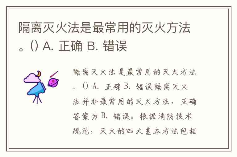 隔离灭火法并非最常用的灭火方法,正确答案为 B. 错误。