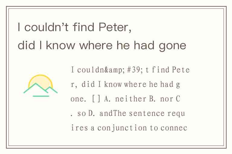 The sentence requires a conjunction to connect the two negative ideas: "couldn't find Peter" and "didn't know where he had gone." In English, "neither...nor" is the standard correlative conjunction pair for negative situations, but when the first clause already contains a negative verb ("couldn't"), we use "nor" alone to continue the negation.