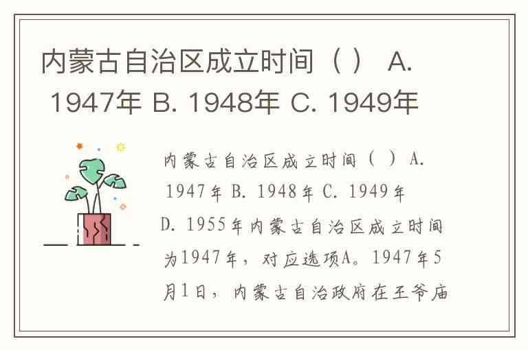 内蒙古自治区成立时间( ) A. 1947年 B. 1948年 C. 1949年 D. 1955年