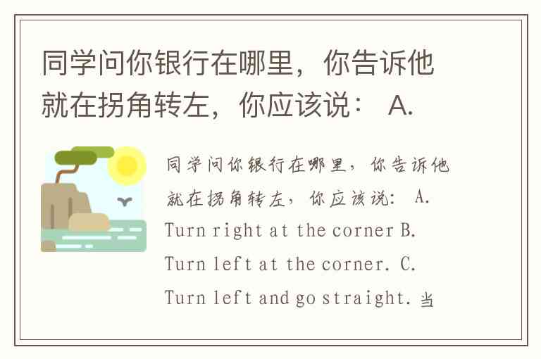当同学询问银行位置并需要指引到拐角左转时,正确的英文表达应直接对应“拐角转左”的核心动作。选项A“Turn right at the corner”方向错误,选项C“Turn left and go straight”多了“直走”这一未提及的步骤,均不符合题意。