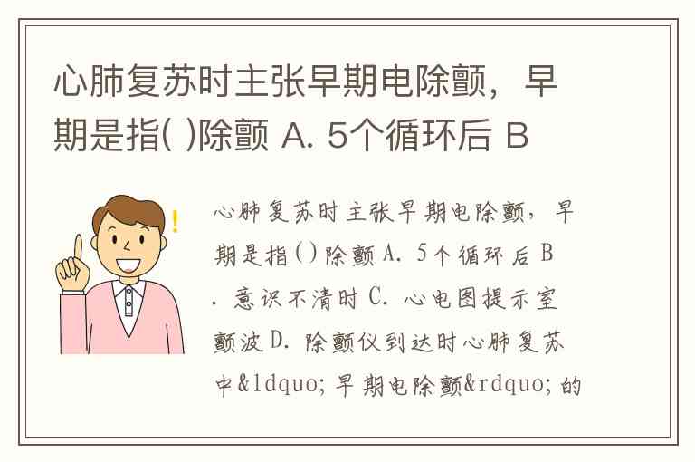 心肺复苏时主张早期电除颤,早期是指( )除颤 A. 5个循环后 B. 意识不清时 C. 心电图提示室颤波 D. 除颤仪到达时