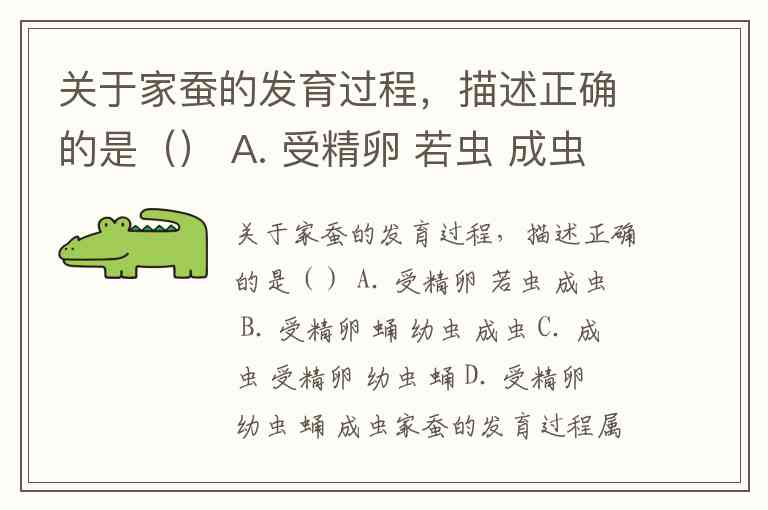 家蚕的发育过程属于完全变态发育,依次经历受精卵→幼虫→蛹→成虫四个阶段,正确答案为 D。这一过程中,家蚕的形态和生活习性会发生显著变化:雌蛾产下的受精卵孵化成幼虫(蚕宝宝),幼虫通过4次蜕皮、5个龄期的生长后吐丝结茧,在茧内化为蛹,最终羽化为成虫(蚕蛾)完成生命周期。