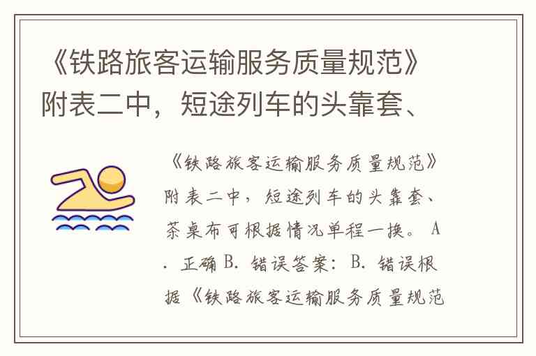 《铁路旅客运输服务质量规范》附表二中,短途列车的头靠套、茶桌布可根据情况单程一换。 A. 正确 B. 错误