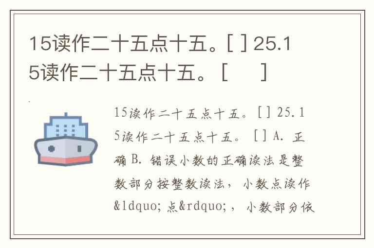 小数的正确读法是整数部分按整数读法,小数点读作“点”,小数部分依次读出每个数字。“25.15”中,整数部分“25”读作二十五,小数点读作点,小数部分“15”应依次读“一五”,而非“十五”,正确读法是“二十五点一五”。题目表述错误。