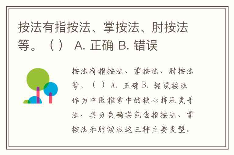 按法有指按法、掌按法、肘按法等。( ) A. 正确 B. 错误