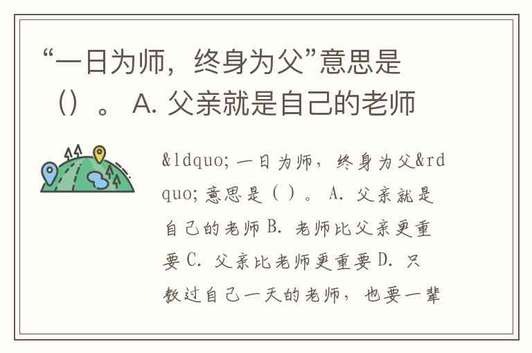 “一日为师,终身为父”意思是()。 A. 父亲就是自己的老师 B. 老师比父亲更重要 C. 父亲比老师更重要 D. 只教过自己一天的老师,也要一辈子当作父亲一样尊重