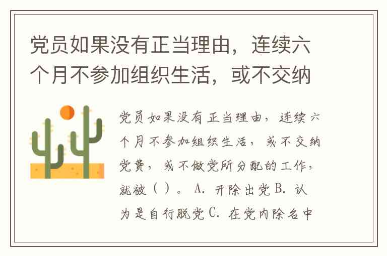 党员如果没有正当理由,连续六个月不参加组织生活,或不交纳党费,或不做党所分配的工作,就被()。 A. 开除出党 B. 认为是自行脱党 C. 在党内除名