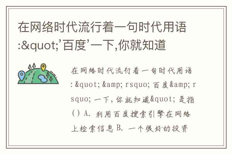 在网络时代流行着一句时代用语:"’百度’一下,你就知道"是指( ) A. 利用百度搜索引擎在网络上检索信息 B. 一个很好的投资项目 C. 一个专家 D. 一家理财公司