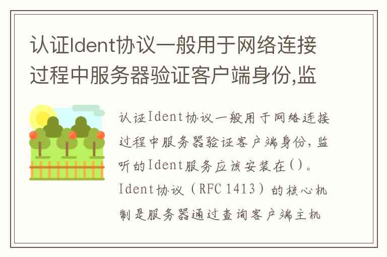 认证Ident协议一般用于网络连接过程中服务器验证客户端身份,监听的Ident服务应该安装在( )。