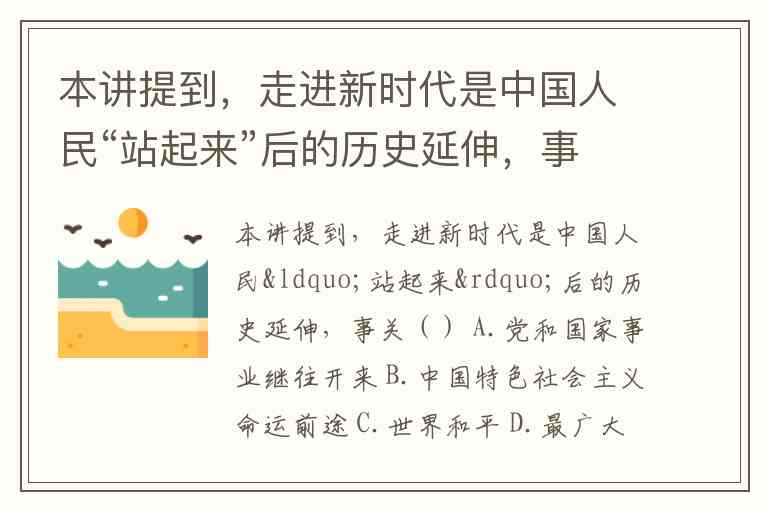 根据描述,“走进新时代是中国人民‘站起来’后的历史延伸”,这一表述强调的是中国特色社会主义事业在历史长河中的延续和发展,特别是中国在实现民族复兴、国家强盛的道路上进入的新阶段。这个阶段事关中国特色社会主义的命运与前途,因为新时代标志着中国特色社会主义进入了新的发展阶段,涵盖了经济、政治、文化、社会、生态等各方面的全面发展。