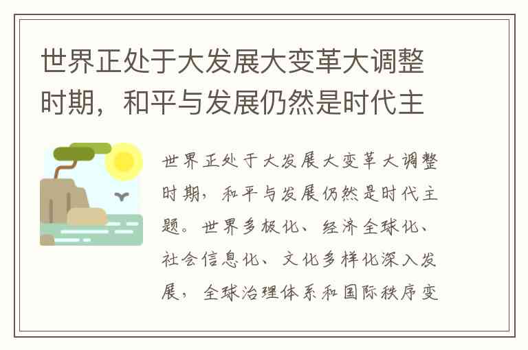 世界正处于大发展大变革大调整时期,和平与发展仍然是时代主题。世界多极化、经济全球化、社会信息化、文化多样化深入发展,全球治理体系和国际秩序变革加速推进,各国相互联系和依存日益加深,国际力量对比更趋平衡,和平发展大势不可逆转。同时,世界面临的不稳定性不确定性突出,世界经济增长动能不足,贫富分化日益严重,地区热点问题此起彼伏,恐怖主义、网络安全、重大传染性疾病、气候变化等非传统安全威胁持续蔓延,人类面临许多共同挑战。