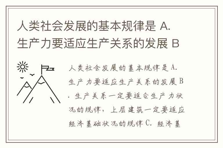 人类社会发展的基本规律是 A. 生产力要适应生产关系的发展 B. 生产关系一定要适合生产力状况的规律,上层建筑一定要适应经济基础状况的规律 C. 经济基础与上层建筑的矛盾 D. 经济基础要适应上层建筑的状况