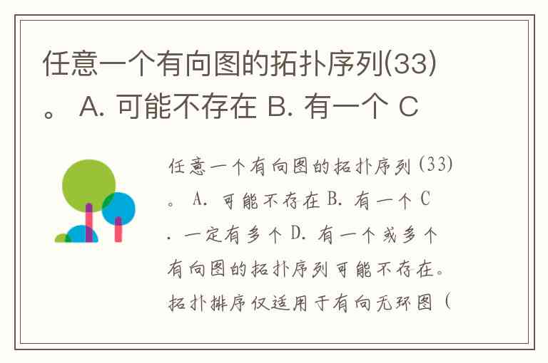 任意一个有向图的拓扑序列(33)。 A. 可能不存在 B. 有一个 C. 一定有多个 D. 有一个或多个