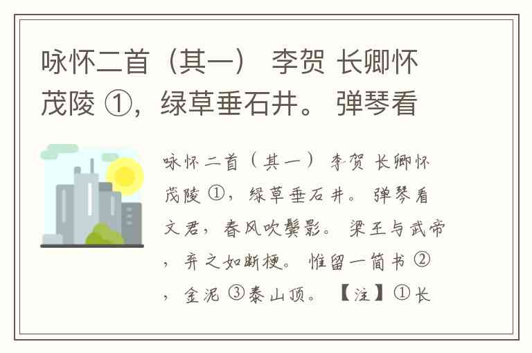 此诗以“绿草垂石井”的幽静起笔,以“金泥泰山顶”的虚妄作结,看似写古人,实则“巧妙地将自己融化进去”,茂陵闲居正是诗人“昌谷赋闲的写照”。当我们透过“春风吹鬓影”的唯美表象,读到的恰是一个天才诗人对自身命运的沉痛自况:所谓“逍遥”,不过是失意者最后的体面。