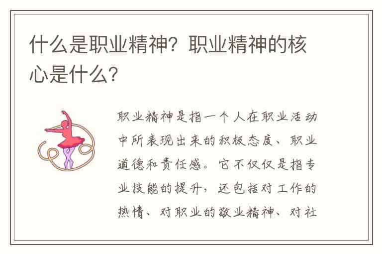 职业精神是指一个人在职业活动中所表现出来的积极态度、职业道德和责任感。它不仅仅是指专业技能的提升,还包括对工作的热情、对职业的敬业精神、对社会和他人负责的意识。职业精神体现的是个体在职业领域中的品德、行为、态度和责任感,尤其是在工作中展现出的敬业、负责、协作与创新的精神风貌。