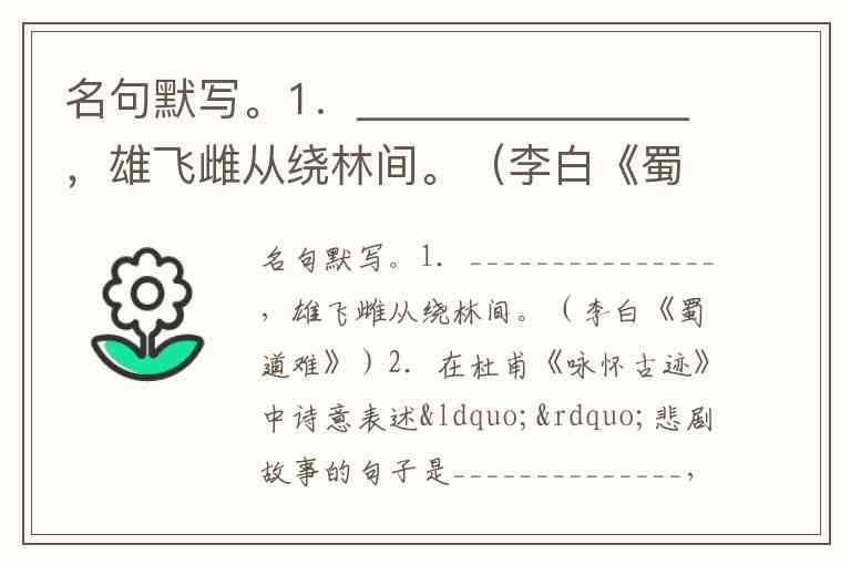 名句默写。1._______________,雄飞雌从绕林间。(李白《蜀道难》)2.在杜甫《咏怀古迹》中诗意表述“”悲剧故事的句子是______________,_____________________。3.韩愈认为从事学习的原因是:_______________,孰能无惑?4.最能表现杜甫忧国情怀的诗句是:艰难苦恨繁霜鬓,___________________。(《登高》)
