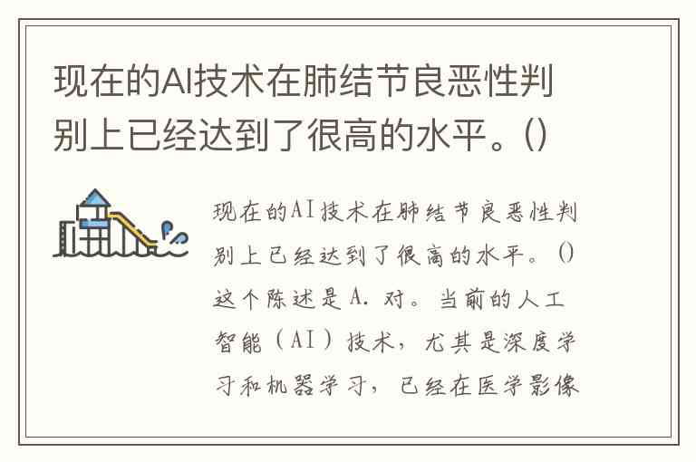 当前的人工智能(AI)技术,尤其是深度学习和机器学习,已经在医学影像领域取得了显著进展,尤其在肺结节的良恶性判别方面达到了很高的水平。AI可以通过对大量医学影像(如CT扫描图像)的学习,自动分析肺结节的特征,准确地判断其是良性还是恶性。