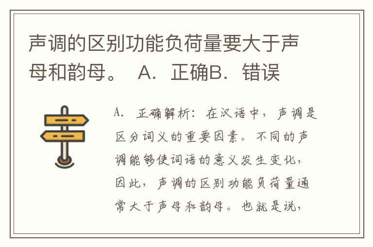 解析:在汉语中,声调是区分词义的重要因素。不同的声调能够使词语的意义发生变化,因此,声调的区别功能负荷量通常大于声母和韵母。也就是说,同样的声母和韵母,通过改变声调可以得到不同的词汇,体现了声调在语言中的高功能负荷。例如,“妈(mā)”和“马(mǎ)”仅通过声调的不同就区分了两个词的意义。