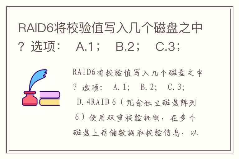 RAID6将校验值写入几个磁盘之中?选项: A.1; B.2; C.3; D.4