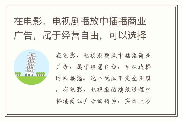 因此,在电影、电视剧播放中插播商业广告并不是完全自由选择的,它需要遵循相关的法律法规,并且合理安排广告插播的时间、时长和内容,以保护观众的观看体验和权益。