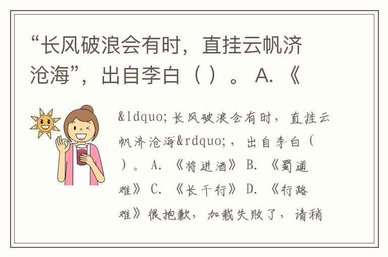 “长风破浪会有时,直挂云帆济沧海”,出自李白( )。 A. 《将进酒》 B. 《蜀道难》 C. 《长干行》 D. 《行路难》