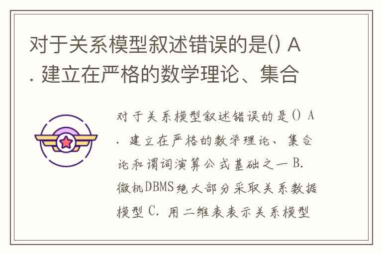 对于关系模型叙述错误的是() A. 建立在严格的数学理论、集合论和谓词演算公式基础之一 B. 微机DBMS绝大部分采取关系数据模型 C. 用二维表表示关系模型是其一大特点 D. 不具有连接操作的DBMS也可以是关系数据库管理系统