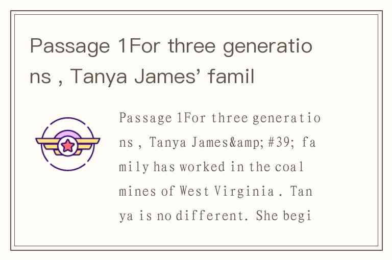 Passage 1For three generations , Tanya James' family has worked in the coal mines of West Virginia . Tanya is no different. She begin working in the mines in 1979, when only about 1 in 100 coal miners were women-and she didn't begin under the happiest of circumstances . Her father died when she was 17, leaving her mother to take care of the family. Out of necessity, Tanya's mother took a mining class, and Tanya would go down with her every day-so the instructor invited Tanya to join the class. Six months later, Tanya was working in the mines as well. "I know what it feels like to have your mother in the mines. And it could be a little rough," Tanya James, now a mother herself, telIs her daughters Michelle Paugh and Trista James on a recent visit with StoryCorps . "I was pretty protective of her, even though I knew she could protect herself. I saw her once pick up a guy by the neck," she laughs, "so she was a tough cookie. "From an early age, Tanya James says, she learned an important lesson from her mother: "If you don't fight for yourself, nobody else gonna do it for you. "That attitude helped give her the strength to deal with an environment that wasn't exactly welcoming to women. It was a long held suspicion among miners that it was bad luck for a woman to even enter a mine. When a woman did enter one, many people figured, it was just to find a man. And that's to say nothing of the ers awaiting her in the deeps from the men themselves . In a survey that came out of the 1980 National Conference of Women Coal Miners, it was found that 76 percent of female coal miners had been ually offended by coworkers. Seen percent had been physically attacked. "You had to make them respect vou. You had to prove yourself daily ,”Tanya says. “I don't believe in stuff being handed to you. I think you need to work for everything you get. ”Tanya James spent more than 20 years in the coal mines, and recently she became the first woman to hold a seat on the international executive board of the United Mine Workers of America. She's tried to convince her daughters of what she believed. "You're an extraordinary woman, "her daughter Trista said to her, "and I would like to be one in the future, too. " Why did Tanya start working as a coal miner? A. To prove herself in society. B. To meet the needs of the family. C. To follow in her father's footsteps. D. To live up to her mother's expectations.