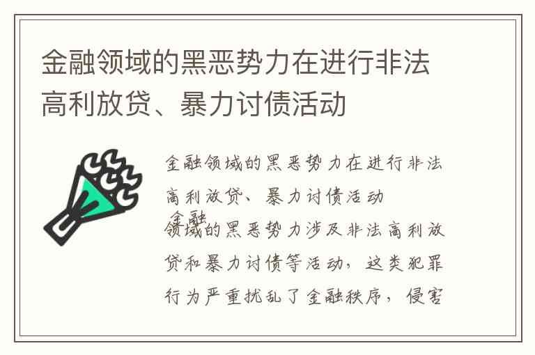 金融领域的黑恶势力涉及非法高利放贷和暴力讨债等活动,这类犯罪行为严重扰乱了金融秩序,侵害了社会公共安全,甚至威胁到国家经济的稳定。以下是金融领域黑恶势力常见的几种活动形式及其危害: