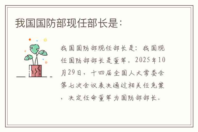 我国现任国防部部长是董军。2025年10月29日,十四届全国人大常委会第七次会议表决通过相关任免案,决定任命董军为国防部部长。