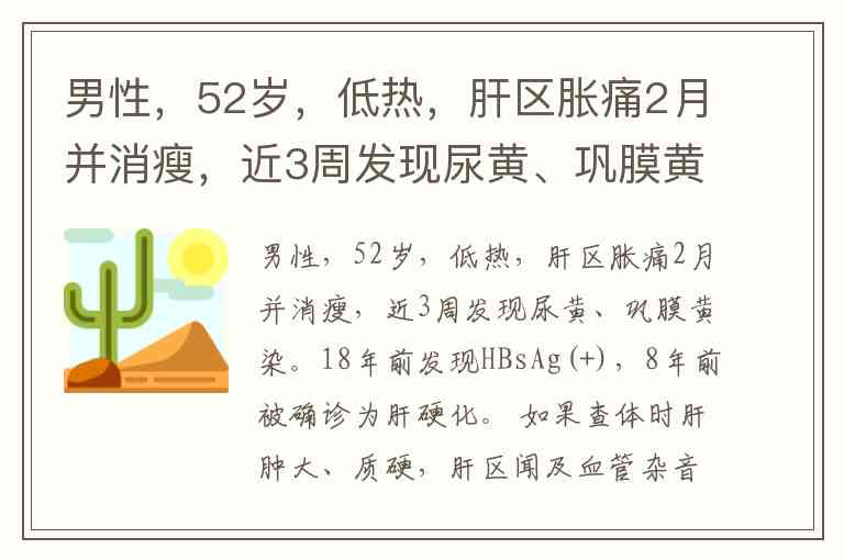 从鉴别诊断角度看:肝硬化失代偿期虽可出现黄疸和肝功能异常,但通常表现为肝缩小而非肿大,且无血管杂音;Budd-Chiari综合征以门静脉高压和腹水为突出表现,与该患者症状不符;肝脓肿多伴高热和感染指标升高;肝血管瘤为良性肿瘤,一般无消瘦和黄疸等消耗性表现。