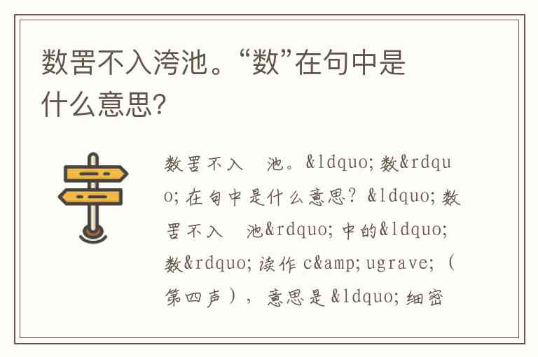 “数罟不入洿池”中的“数”读作 cù(第四声),意思是 “细密”,形容渔网的网眼致密 。这句话出自《孟子·梁惠王上》,是孟子向梁惠王阐述“王道之始”时提出的生态保护理念,完整表述为“不违农时,谷不可胜食也;数罟不入洿池,鱼鳖不可胜食也;斧斤以时入山林,材木不可胜用也” 。