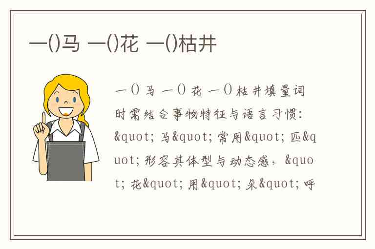 填量词时需结合事物特征与语言习惯:"马"常用"匹"形容其体型与动态感,"花"用"朵"呼应植物绽放形态,"枯井"用"口"对应其垂直空间形态。