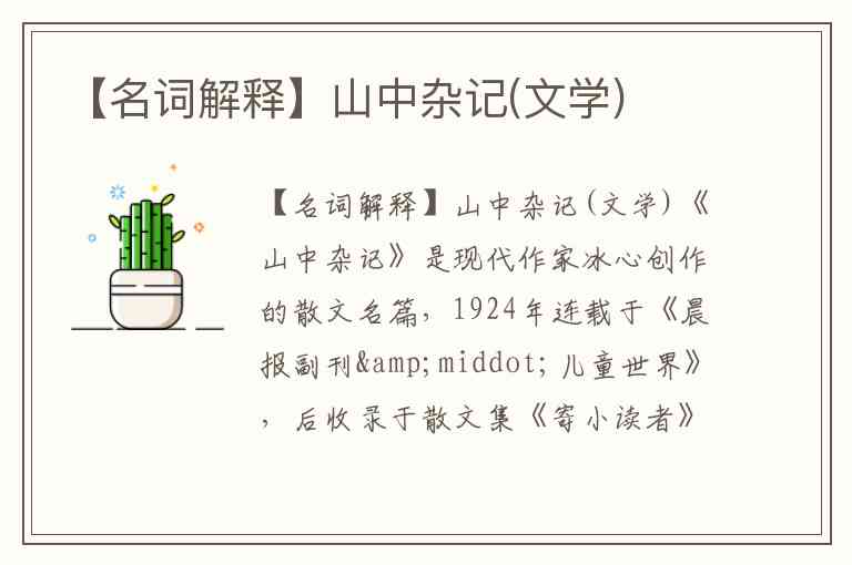 《山中杂记》是现代作家冰心创作的散文名篇,1924年连载于《晨报副刊·儿童世界》,后收录于散文集《寄小读者》。这组共10篇的散文诞生于作者留美养病期间,以细腻笔触描绘自然万物与生命百态,成为中国儿童文学的经典范本。