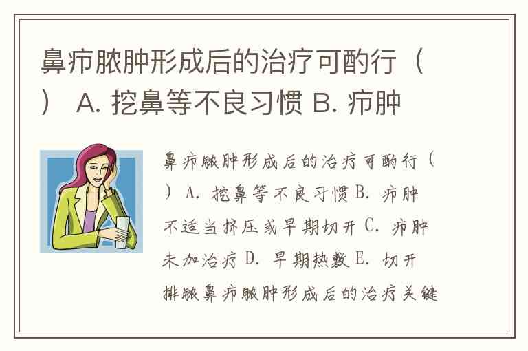 鼻疖脓肿形成后的治疗可酌行() A. 挖鼻等不良习惯 B. 疖肿不适当挤压或早期切开 C. 疖肿未加治疗 D. 早期热敷 E. 切开排脓
