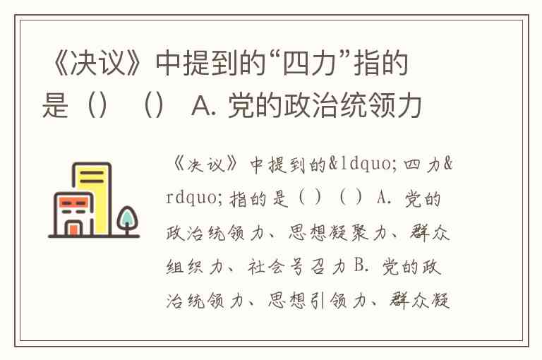 《决议》中提到的“四力”指的是()() A. 党的政治统领力、思想凝聚力、群众组织力、社会号召力 B. 党的政治统领力、思想引领力、群众凝聚力、社会号召力 C. 党的政治领导力、思想引领力、群众组织力、社会号召力 D. 党的政治领导力、思想引领力、群众凝聚力、社会号召力