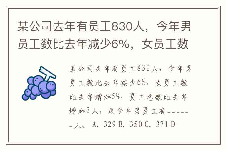 某公司去年有员工830人,今年男员工数比去年减少6%,女员工数比去年增加5%,员工总数比去年增加3人,则今年男员工有______人。 A. 329 B. 350 C. 371 D. 504