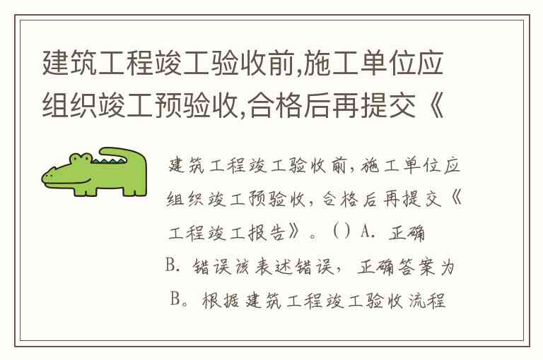 建筑工程竣工验收前,施工单位应组织竣工预验收,合格后再提交《工程竣工报告》。( ) A. 正确 B. 错误