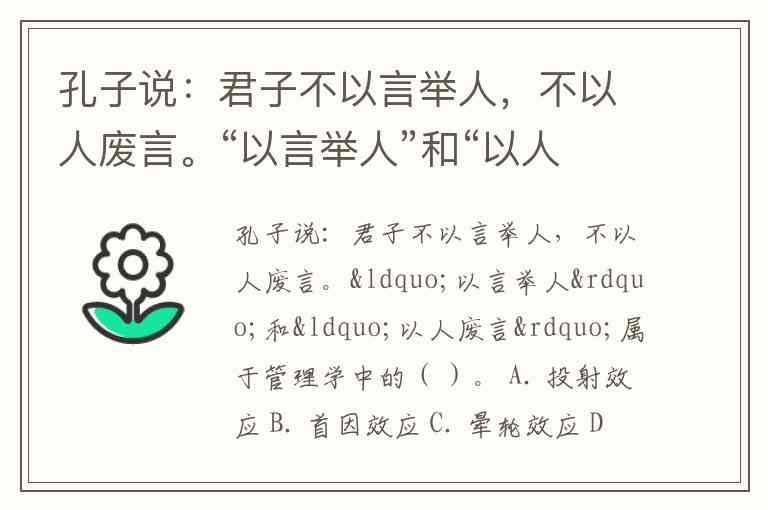 孔子说:君子不以言举人,不以人废言。“以言举人”和“以人废言”属于管理学中的( )。 A. 投射效应 B. 首因效应 C. 晕轮效应 D. 效应