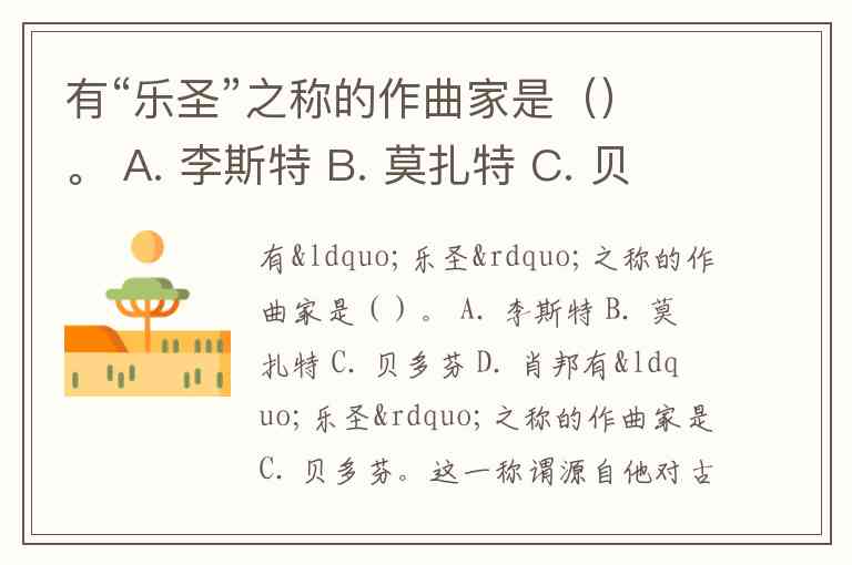 有“乐圣”之称的作曲家是()。 A. 李斯特 B. 莫扎特 C. 贝多芬 D. 肖邦