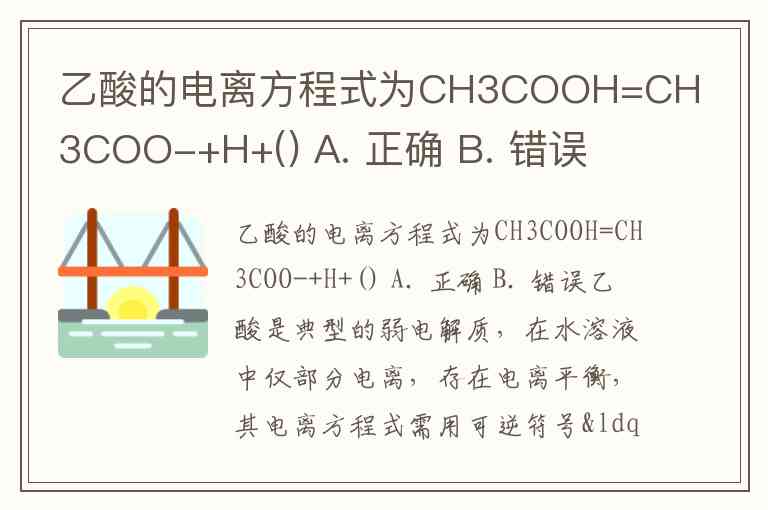 乙酸的电离方程式为CH3COOH=CH3COO-+H+() A. 正确 B. 错误