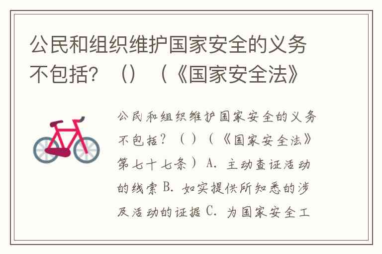 《国家安全法》第七十七条明确了公民和组织维护国家安全的七大义务,核心在于通过规范行为、信息支持和保密责任构建安全防线。从提供的选项来看,A. 主动查证活动的线索并不在法定义务范围内,而“及时报告线索”才是公民应尽的责任。
