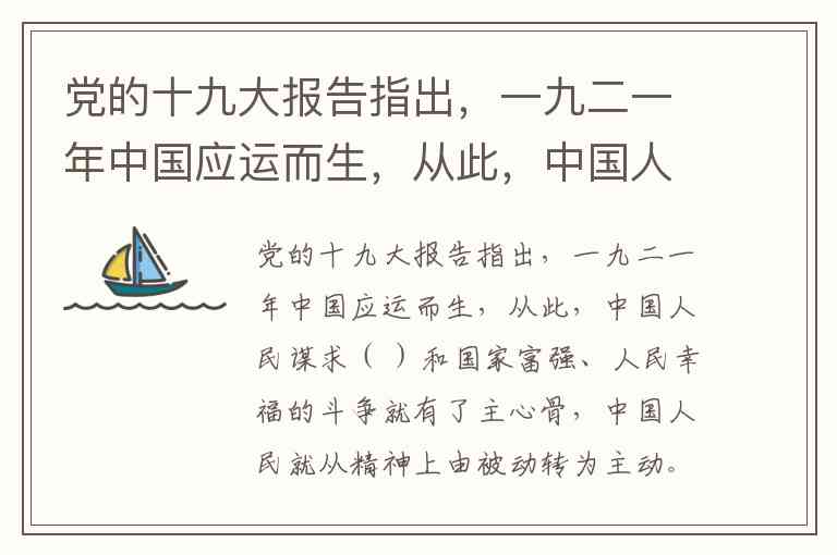 党的十九大报告指出,一九二一年中国应运而生,从此,中国人民谋求( )和国家富强、人民幸福的斗争就有了主心骨,中国人民就从精神上由被动转为主动。 A. 民族独立、人民幸福 B. 民族独立、人民解放 C. 民族崛起、人民解放 D. 民族振兴、人民独立