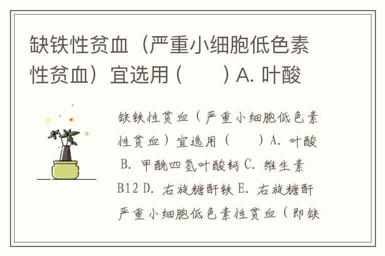 缺铁性贫血(严重小细胞低色素性贫血)宜选用 ( ) A. 叶酸 B. 甲酰四氢叶酸钙 C. 维生素B12 D. 右旋糖酐铁 E. 右旋糖酐