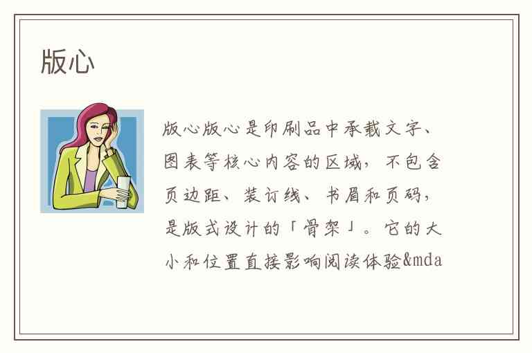 版心是印刷品中承载文字、图表等核心内容的区域,不包含页边距、装订线、书眉和页码,是版式设计的「骨架」。它的大小和位置直接影响阅读体验——过大可能导致文字拥挤、视觉疲劳,过小则浪费纸张且显得内容单薄。