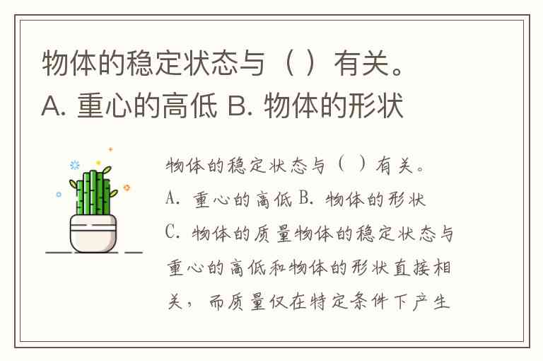 物体的稳定状态与( )有关。 A. 重心的高低 B. 物体的形状 C. 物体的质量